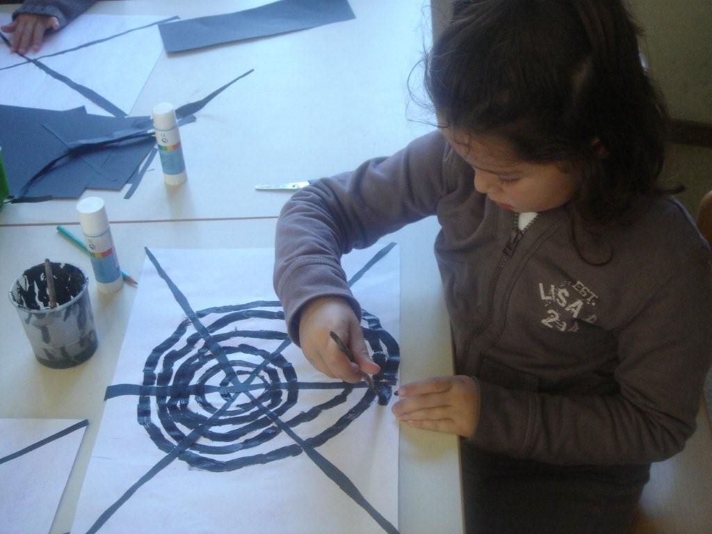Daarna konden onze rakkers heb web verder opbouwen! Zij hadden de keuze uit het werken met een stift, schrijfpotlood, wol of verf. Deze rakker koos voor wol... duidelijk geen makkelijke opdracht.