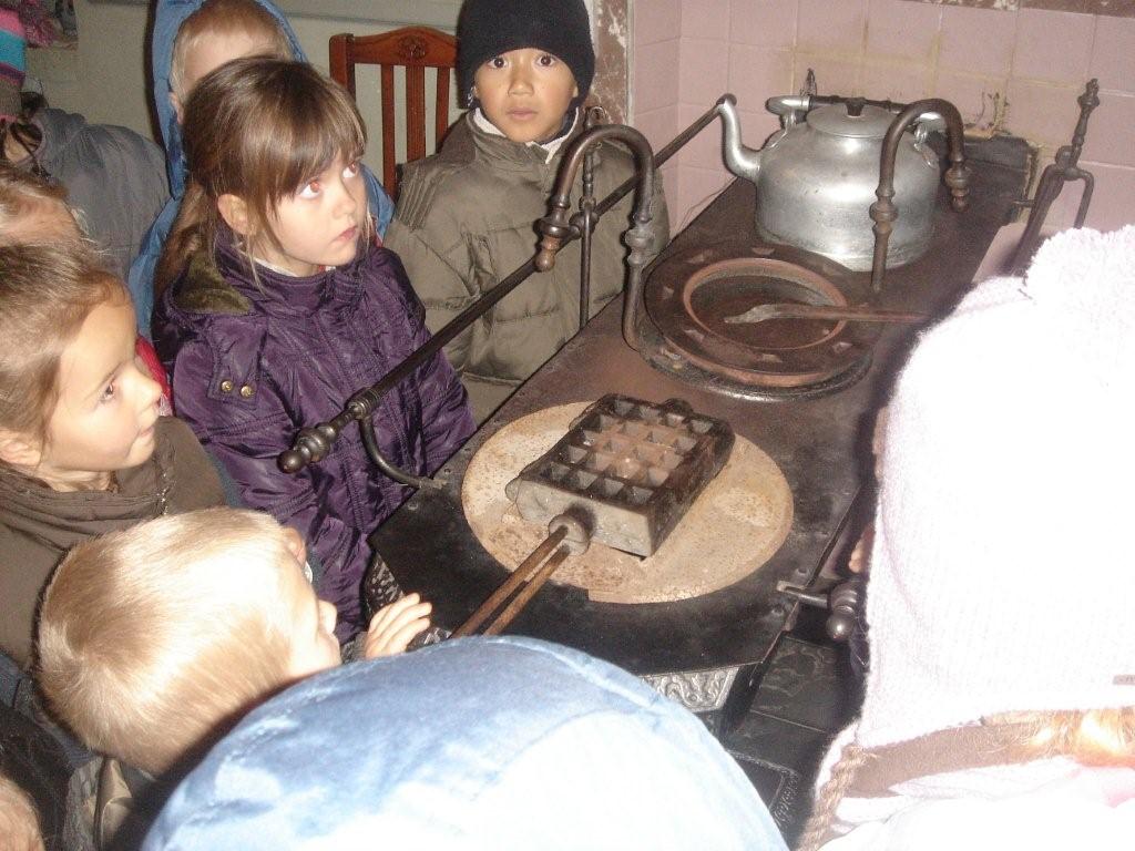 De molenaar van de watermolen verwelkomde ons en nam ons onmiddellijk mee naar het bakhuis. Daar vertelde hij over de 'tijd van toen'; zonder licht. Alleen het licht van het houtvuur. Hij liet ons ook zien hoe de mensen vroeger wafeltjes bakten, met een heel zwaar wafelijzer... op de stoof!
