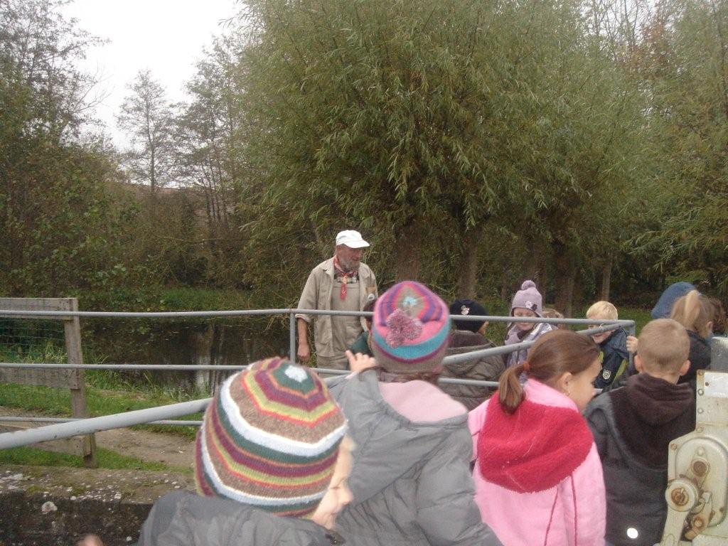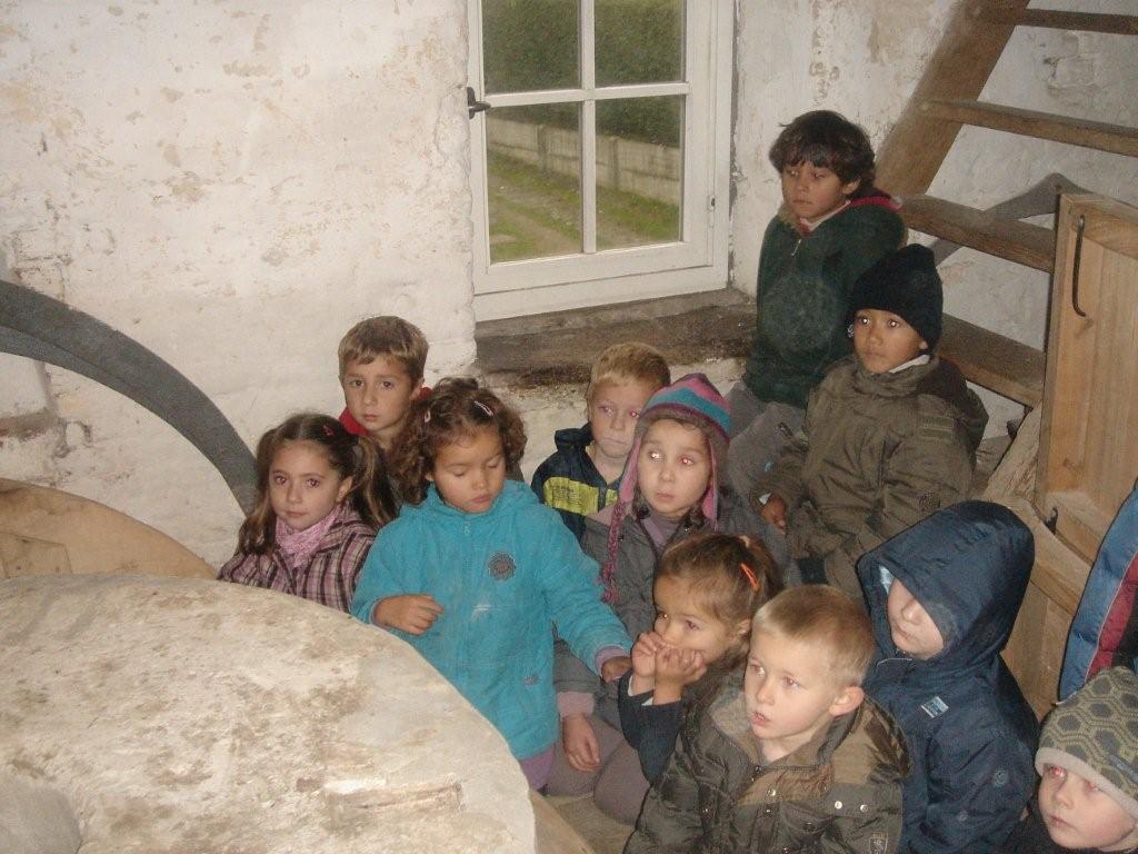 De molenaar nam ons mee in de molen. Maar waar zijn de wieken? De luizenmolen had wieken en deze niet??? Hij vertelde ons dat deze molen werkte met een waterrad nl een schoebbenrad. Wanneer elk bakje gevuld was kon de loper draaien over de ligger... wat een werking!