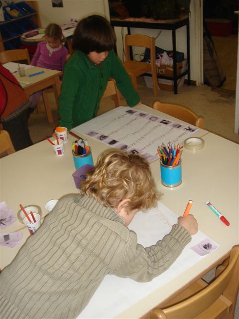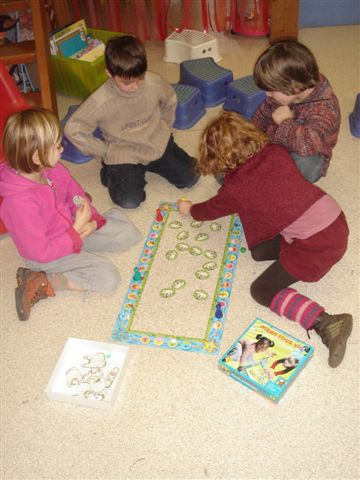 Op deze manier leerden onze rakkers om te gaan met de getalbeelddobbelsteen en de 1-1relatie alsook omgaan met verklanken van de beginletter, letters loskoppelen van letters van enkele eenvoudige woordjes (vb. de 'v' van verf, de 's' van sok).