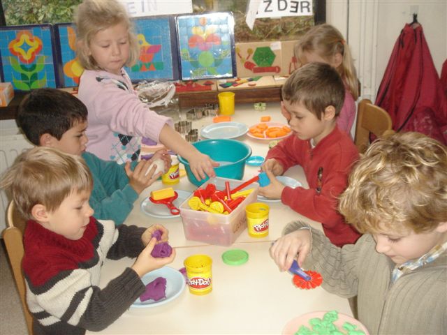 Nog andere rakkers verkozen om te werken met plasticine. Met drukstempels van cijfers en letters werden allerlei leuke dingen gemaakt. Maak jij is een taart voor mij? Stempel jij mijn naam erin? Hé, dit is dezelfde letter van mijn naam, of de 2de of 3de letter is dezelfde als mijn beginletter.