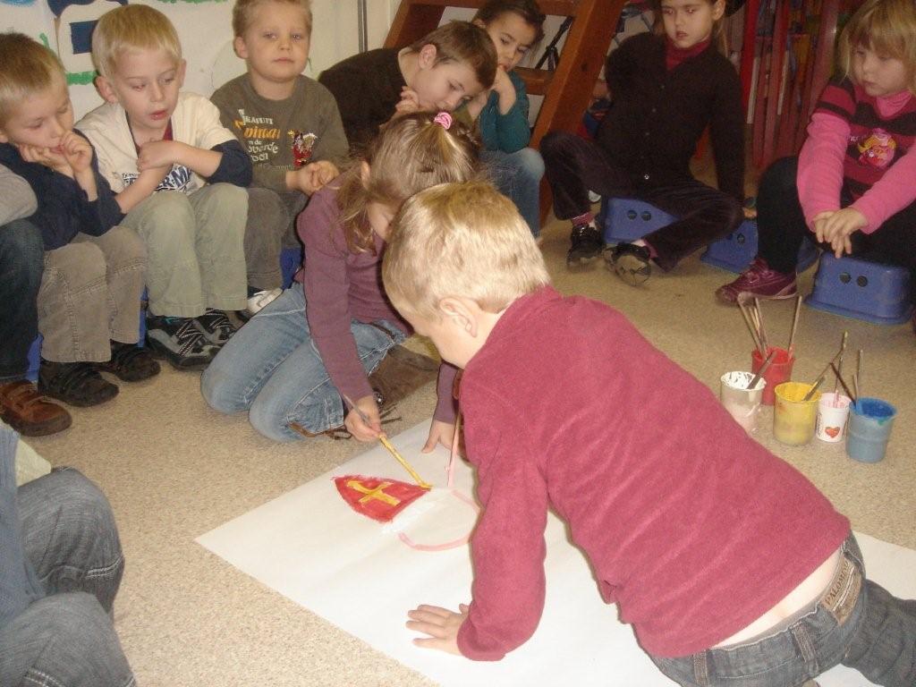 Sinterklaas is getekend, geschilderd! Wie hoort erbij de sint? Zwarte Piet natuurlijk. Terwijl er heel wat discussie was over de kleur van mijter van Sint waren onze rakkers het vlug eens de de piet een 2kleurige muts mocht hebben. Met prachtige pluimen...struisvogelpluimen!
