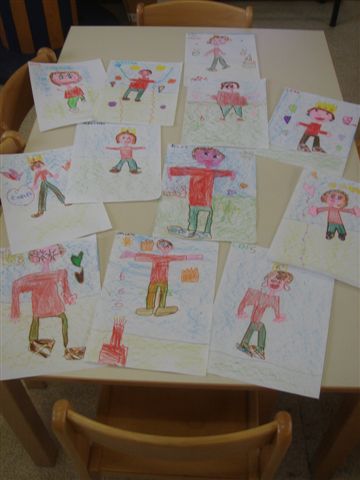 Op het einde van ons thema kregen onze schilderwerkjes een plaats in onze klas en dan werd alles nog eens besproken. Wie zijn linkerkant is er hier geschilderd? Van wie is de rechterkant? Hoe zit het met de bloemetjes en de vogeltjes aan de linkerkant, aan de rechterkant? We trachtten zo goed mogelijk te verwoorden hoeveel bloemetjes er werden getekend, hoeveel vogeltjes,... Hier stond omgaan en begrijpen van rekentaalbegrippen centraal (1 meer, 1 minder, 2 meer, 2 minder)