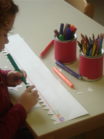 De overige rakkers kregen een papier waar zij het verschil aanbrachten tussen lucht en land met potlood. Daarna tekenden zij Nel zo gedetailleerd mogelijk. Achteraf vertelde elke kleuters waar Nel zich op haar of zijn papier bevond. Hier werd het accent gelegd op ruimte! Zo tekenden sommige kleuters Nel al vliegend, andere kleuters tekenenden Nel vooraan in het gras of achteraan. Kortom, heel wat variatie