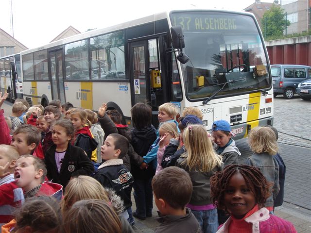 Op maandag 21/5 stonden we allemaal paraat om te vertrekken richting Brussel-Zuid. Hoe geraken we daar met het openbaar vervoer? Moeilijke vraag... na veel nadenken kwam er dan toch een wijs idee: juf, de lijnbus. We gingen op zoek in het uurregelingsboekje naar het juiste uur en de passende bus voor onze bestemming. Onze bus had lijnnummer 137! Om 9.25u namen we onze bus op de Ninoofsesteenweg. Daar hadden we even de tijd om nog eens kort te herhalen over ons bezoek aan de stelplaats alsook enkele belangrijke afspraakjes te maken voor onze uitstap naar Brussel. En nu maar wachten en kijken naar lijnbus nr 137!