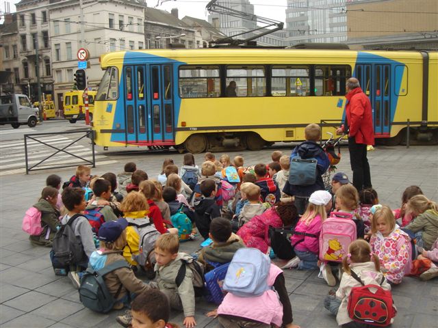 Nu effe een kijkje nemen buiten het station. Waw juf kijk een bus op sporen en die hangt ook vast aan spandraden??? Is dit dan wel een bus? Al vlug kwamen we tot de ontdekking dat dit een tram was. Een tram rijdt op sporen en hangt ook vast met spandraden. Een tram rijdt op de straat tussen het verkeer door. Mag die altijd doorrijden? He, kijk gekke verkeerslichten: een plat streepje, een recht streepje een schuin streepje, een bolletje??? Kijken maar hoe de tram hierop reageert. Op deze manier leerden we meer over het tramverkeer