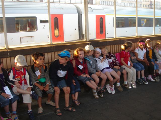 Donderdag 24 mei... voor onze rakkers een langverwachte dag. Om 7.15u stond iedereen paraat op het perron van het station in Dilbeek richting Brussel. Eerst vlug enkele afspraken maken, kaartjes hechten en daar was de trein. Onze plaats werd aangeduid met een wit-rood papiertje op de vensters van de trein... plaatsen zoeken en dan maar kijken en genieten.