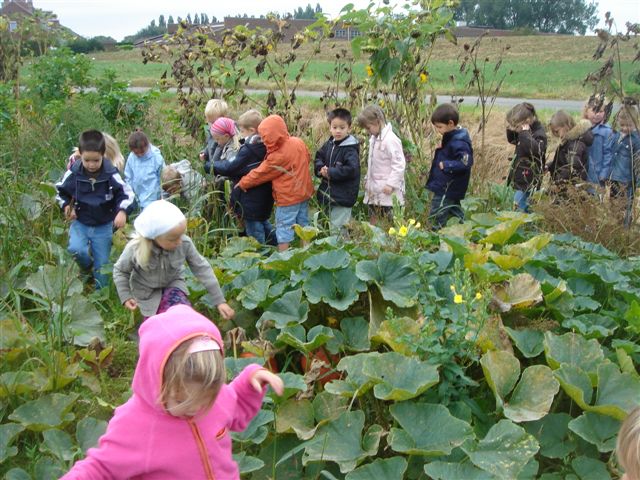 Het bleef niet alleen bij kijken, voelen, op ontdekking gaan... maar ook even luisteren naar wat weetjes van de juf. Zo wist onze juf te vertellen dat een pompoen groeit vanuit een klein zaadje. Dat een pompoenplant ver kan kruipen. Sommige kleuters vonden bloemen op de plant. He, juf kijk bloemen die verwelkt zijn met daarachter een bolletje... Wat wil dit zeggen? Onze juf vertelde dat je meisjesbloemen en jongensbloemen hebt. De zaadjes van de jongen wordt door een bijtje bij het meisje gebracht en oeps ... dat is zoals een baby, wist een bengel te vertellen. En ja hoor, lukte het, dan gaat het bloempje dood en kan het bolletje uitgroeien tot een reuzepompoen! Enkele rakkers merkten op dat elke pompoen dus een meisje is! Wat een reuzebladeren!! Tjonge, tjonge, dat hebben we nog nooit gezien...
