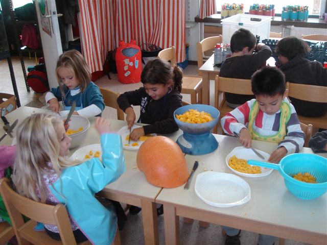 Wat hebben we nodig? Wie weet het van thuis? Enkele kleuters wisten me te vertellen dat er een ui bijmocht. De boter werd op het vuur in de kom gezet, kijk... de boter smelt. Opgepast want nu is de kom wel heet. Terwijl werd de reuzepompoen in stukjes gesneden. Een echte karwei want een pompoen is niet zo zacht vanbinnen. Eerst de harde schil wegsnijden. Dat was werk voor de juf... nu onze rakkers en bengels aan het werk! De gesneden pompoen werd gewogen met een weegschaal een gewassen in een vergiet. Nu alles in de kom en dan nog water bij. Het water werd gemeten met een maatbeker, niet met een weegschaal juf dat kan niet. Nu op wat wachten tot alles kookt, af en toe eens roeren en wat op smaak brengen.