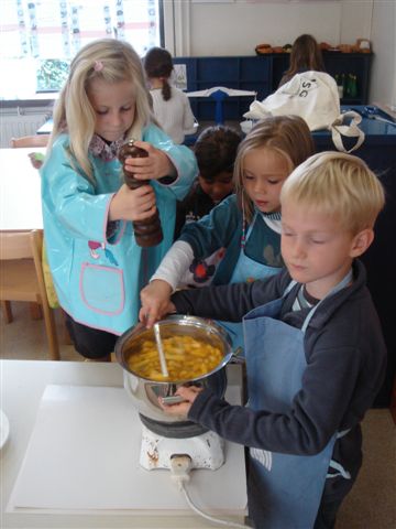 Wat hebben we nodig? Wie weet het van thuis? Enkele kleuters wisten me te vertellen dat er een ui bijmocht. De boter werd op het vuur in de kom gezet, kijk... de boter smelt. Opgepast want nu is de kom wel heet. Terwijl werd de reuzepompoen in stukjes gesneden. Een echte karwei want een pompoen is niet zo zacht vanbinnen. Eerst de harde schil wegsnijden. Dat was werk voor de juf... nu onze rakkers en bengels aan het werk! De gesneden pompoen werd gewogen met een weegschaal een gewassen in een vergiet. Nu alles in de kom en dan nog water bij. Het water werd gemeten met een maatbeker, niet met een weegschaal juf dat kan niet. Nu op wat wachten tot alles kookt, af en toe eens roeren en wat op smaak brengen.