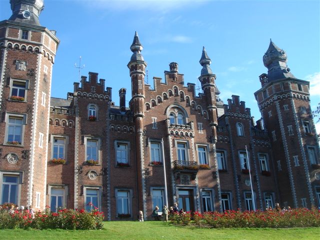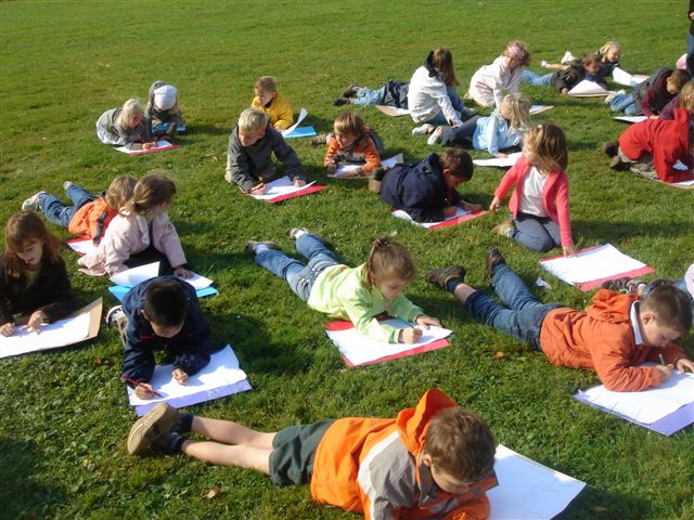 Onze rakkers hadden het wat moeilijker. Als een echte kunstenaar probeerden zij het kasteel van afstand te schetsen... vanop de grond of liever vanop het gras!! kijken en doen!