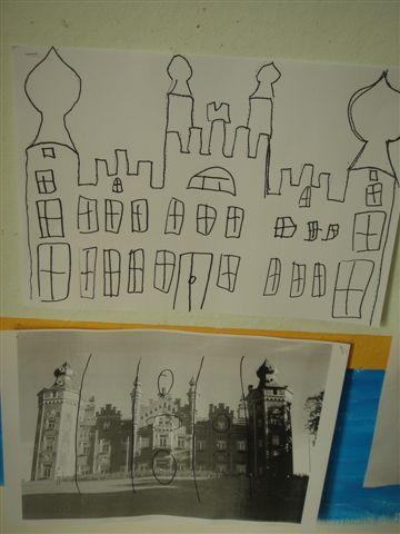 Maandag was een dag vol indrukken, dinsdag werd een dag vol verwerking. Aan de hand van de laptop en de foto's errond herbeleefden we onze maandag. We bekeken het kasteel van Dilbeek nog eens extra en kregen zo oog voor meer detail. Hoe waren onze schetsen. Aan de hand van een zwart-wit foto leerden we dat het kasteel opgedeeld is in 5 delen. We namen elk deel onder de loepen en zagen ze dat de ramen gegroepeerd waren. De torens bekeken we apart. De juf bouwde het kasteel terug op met een stift... onze kleuters zochten in de zwart-wit foto welk deel er telkens bij kwam!!