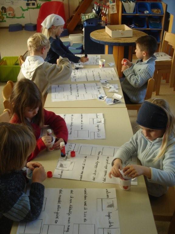 Onze rakkers dachten er goed vanaf te komen. Neen, hoor, ook voor hen ligt een brief klaar. Deze weliswaar ietsipietsie moeilijker. Zij werken rond letters visueel te herkennen en dit binnen woorden. Zij leren ook het belang om van links naar rechts te kijken en zoeken naar verschillen in letters/ woorden. Vooraf wat knipwerk. Onze rakkers knipten alles woord-en beeldkaartjes uit. Morgen proberen zij hun brief op te bouwen.
