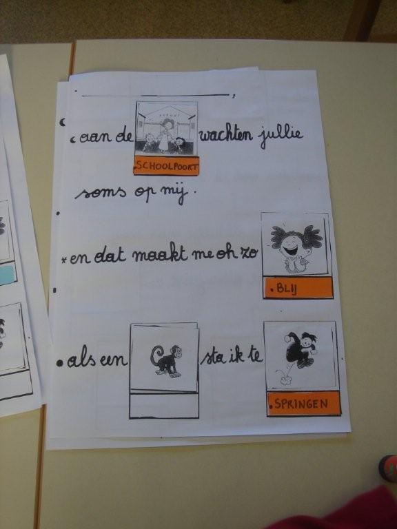 Alles geknipt? Dan zijn we klaar om onze brief eens te horen. Samen werd de brief in de kring aangebracht. Onze rakkers probeerden het woord te visualiseren door het juiste prentje. Zo bouwden ze de brief voor oma en opa op. Nu individueel werken.. ieder zijn eigen brief, zijn eigen uitgeknipte kaartjes. Samen met de juf werd elke zin aangepakt. Welk prentje hoort hierbij? Zoeken maar...