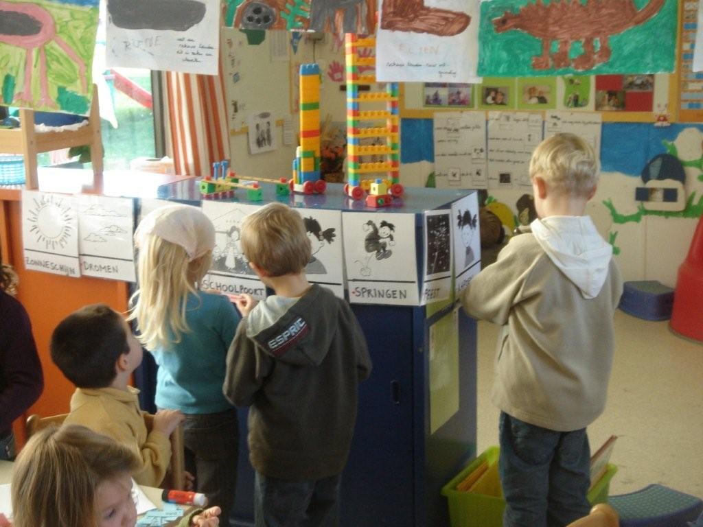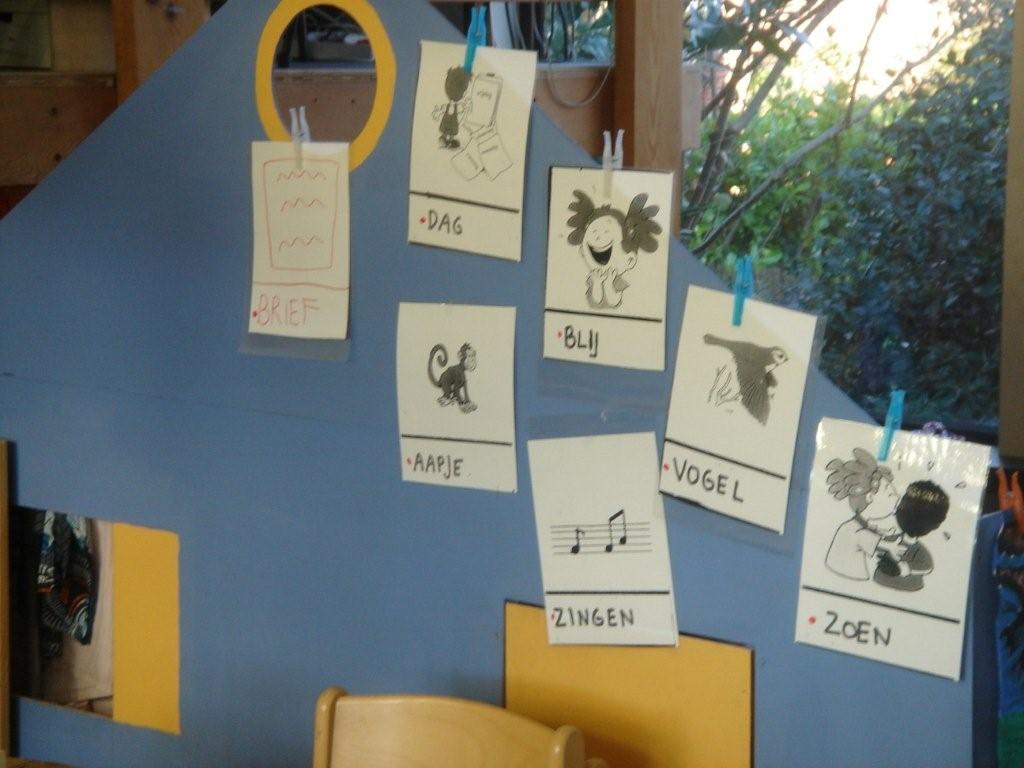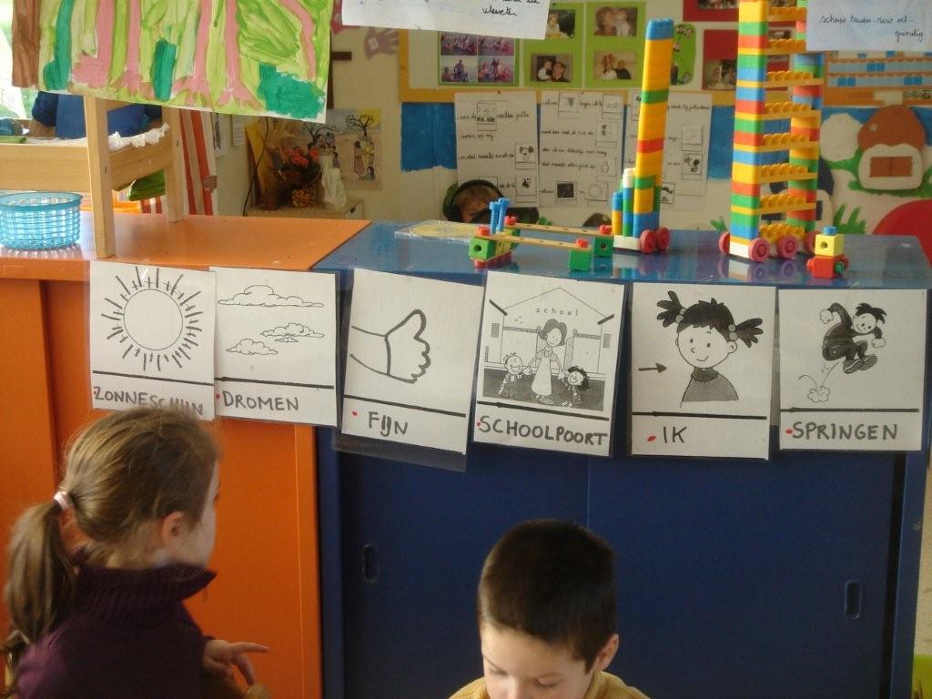 En waarvoor dienen die gekleurde kaartjes dan? Kijk eens goed. Onze rakkers werden uitgenodigd om eens goed te kijken naar het verschil tussen de witte kaartjes en de gekleurde kaartjes. Al vlug kwamen ze tot de ontdekking dat de witte prentjes ook beeldtaal was, de gekleurde prentjes waren de woorden die het beeld weergaven. Aan het werk... de prenten werden in de klas opgehangen en zo gingen alle rakkers individueel zoeken naar het juiste woord. Telkens beginnend van de kant van leen, de linkerkant dus!!!