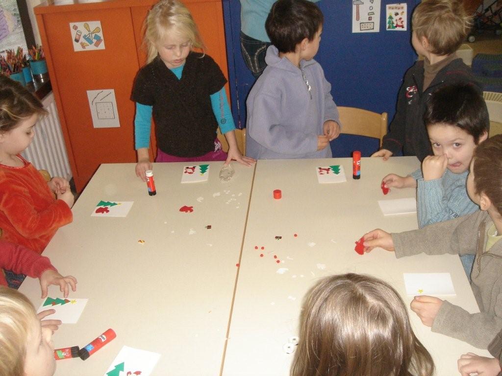Nu zelf aan het werk... Alle rakkers kregen een wit kaartje waar zij precies hetzelfde mochten opkleven zoals in de kring aangebracht.  Onze rakkers gingen op zoek naar de linkerkant, telden hoeveel kerstballetjes, welk stuk naar boven, waar moet de kerstboom.  Eerst een heel zoekwerk met klein, fijn materiaal om daarna een prachtig kerstkaartje te hebben.
