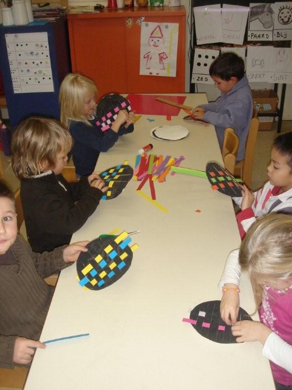 Een ander groepje rakkers werkten ook verder aan hun zwarte pietje.  Zij gingen niet om met patronen, wel met 2 gekleurde repen die ze in het karton gingen weven.   Een nieuwe techniek dus veel werk geblazen.  Op neer, op neer, opgepast niet te hard trekken of het karton is stuk. Heb ik de juiste kleur genomen?  Ben ik juist begonnen?