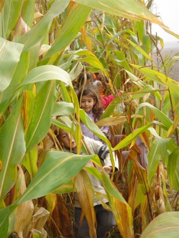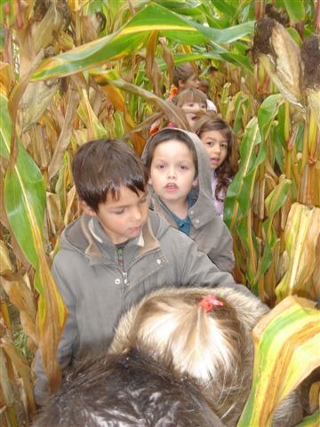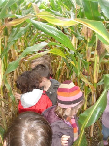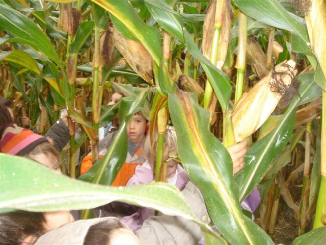 Vanop afstand kijken is niet altijd even makkelijk. Dus dan maar wat dichterbij, of liever er helemaal in. Hé juf kijk de maïsplanten staan mooi in rijtjes, we kunnen er tussen lopen! Piep, wie zie ik daartussen?