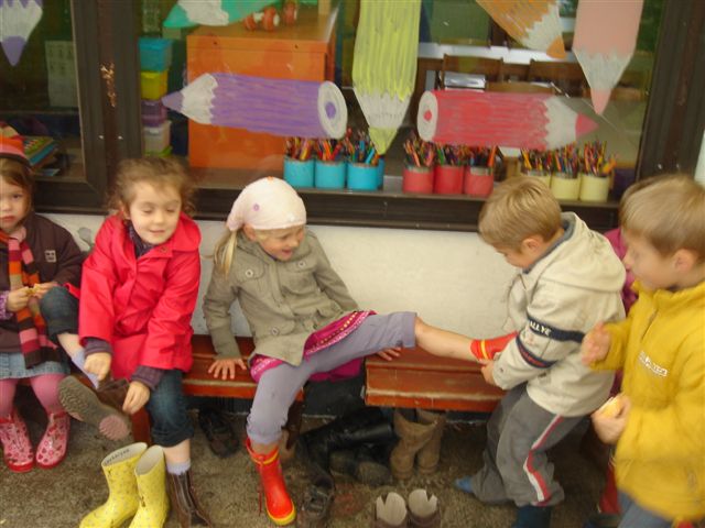 Rijk aan informatie keerden we terug naar onze wijkschooltje. Daar stonden gezonde mandarijntjes op ons te wachten ... eerst vlug onze nieuwtjes vertellen aan juf Lut, juf Veerle en meester Wannes! Dan laarsjes uit, handjes wassen en eten maar! Juf, ik krijg mijn laarsjes niet uit. Even proberen, meid, dan lukt het wel! Kijk is aan wat een helpende handjes in onze klas. Hulp en plezier in 1!!!