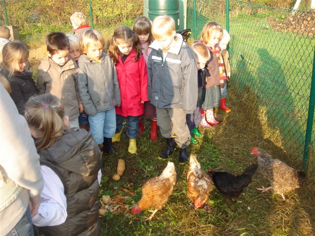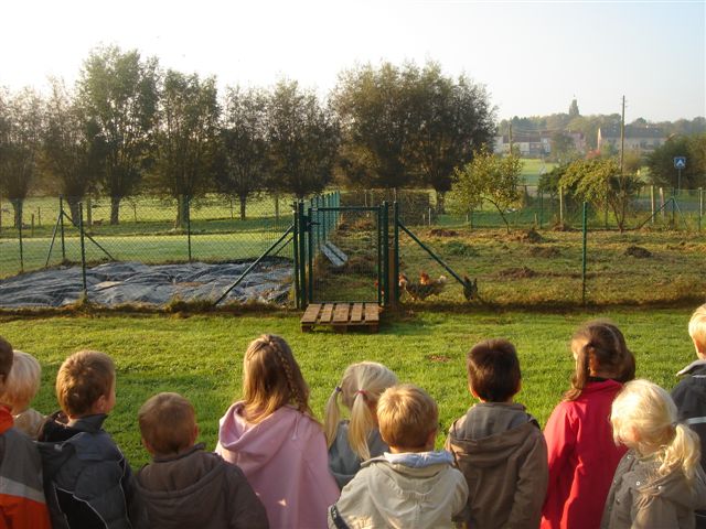 Joepie, ons schooltuintje krijgt vorm. Met hulp van enkele ouders en een fijne werkgroep hebben we alles al in gereedschap gelegd voor onze verdere realisatie van onze tuin. Onze bedoeling is een boomgaard en een kleine moestuin op te bouwen. De ruimte voor onze moestuin is nu bedekt met een zwarte plastic - alles eronder heeft nu tijd om te stikken - in de lente maken we alles weer klaar om te zaaien en planten! Onze boomgaard ... da's wa anders. De putten zijn gegraven dus de fruitbomen kunnen geplant worden. En onze kippen dan? Die horen in de boomgaard, alsook ons konijn. Met een nieuw kippenhok starten we echt weer vanop nul. 4 kippen is wat te weinig voor onze boomgaard, dus op maandag 15/10 gaan we met onze rakkers en bengels naar het Neerhof waar we nog 3 kippen kiezen en aankopen!