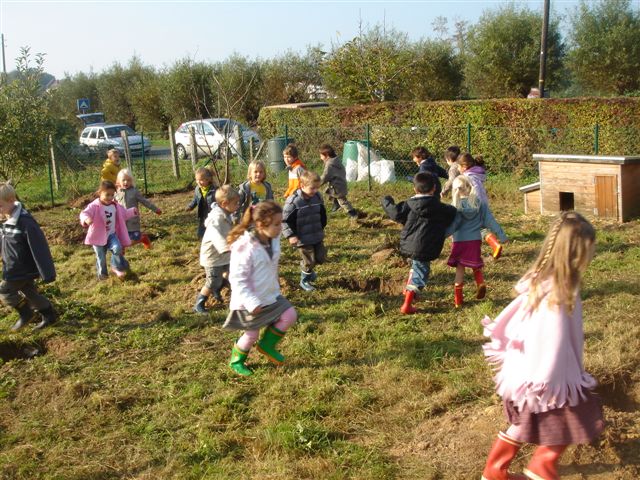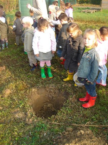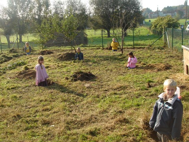 Van ver kunnen we dit niet ontdekken. Dan maar een stapje dichterbij. We doen de poort open en daar staan we dan - op het grote stuk! Hé juf, kijk zo'n diepe kuil! En daar nog zo'n, en nog 1 en nog 1 - zoveel in totaal zijn er wel 8. Ja hoor onze bengels en rakkers hadden gelijk. Er waren diepe kuilen in de aarde gemaakt. Waarom zou dit dienen. Onze kleuters hadden het raden er naar.. toch wist 1 rakker ons te vertellen dat papa dat ook doet als die in de tuin iets wil planten. En dat gaan wij ook doen in deze tuin - fruitboompjes planten. Niet in onze moestuin, want daar horen geen fruitboompjes thuis maar wel in de boomgaard!