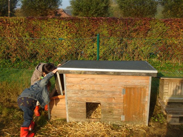In onze boomgaard leven ook kippen en ons konijn. De kippen hebben een nieuw kippenhok gekregen... kijk er maar eens in. Vanaf nu kunnen onze kippen echt slapen zoals het hoort - op een stok. Hé kijk, een speciale bak voor de eitjes, dat is een legbak. Vlug even piepen of er al een eitje in ligt!