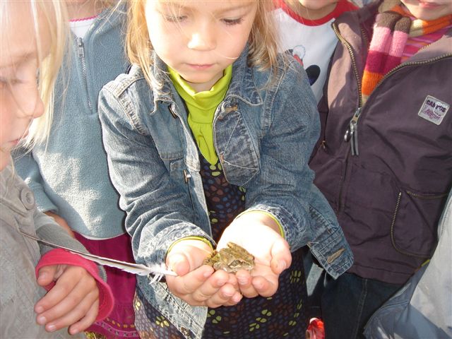 En juist hadden ze. In de kuil zat een kikker. We hielpen hem eruit met een latje van hout. Onze vos die was intussen al lang verdwenen en onze kippen werden omgetoverd in nieuwsgierige bengels en rakkers. Waw...een echte kikker. Eén van de bengels nam de kikker rustig in de handen en zo konden we hem van dichterbij bekijken. Wat is ie glad! Hé, kijk die heeft zwemvliezen? En die zijnachterpoten zijn zo lang als die springt!! Ons spel van de vos en kippen was voorbij... alle aandacht ging naar de kikker!