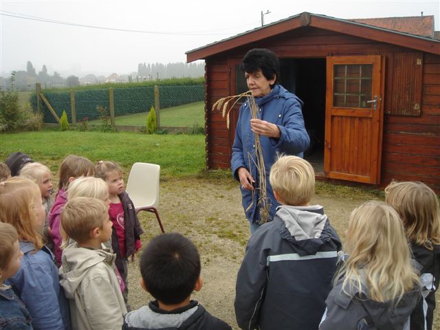 Onze rakkers en bengels wisten nu al wel dat de molen geen luizen had en vanwaar de naam kwam alsook dat de molen heel oud is. Maar ... waarvoor diende deze molen? De mevrouw vertelde ons dat de molen gebruikt werd om graan te malen? Graan? Ja, graan vanop het veld. De mevrouw liet zien wat graan was. Veel kleuters herkenden het van op het veld bij de boer dichtbij ons wijkschooltje. Malen? Verpletteren tussen 2 stenen en dan komt er meel of bloem vrij. Wat kan ons mama allemaal doen met bloem? Dat wisten ze allemaal we te vertellen.. cake, pannenkoeken, koekjes, taart, ...