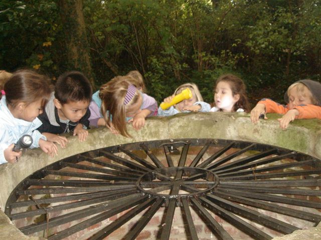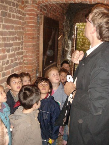 We leerden wat een kelder was. Waarom naar beneden stappen? Wie heeft er thuis ook een kelder? Wie heeft een zolder? Wat is het verschil? De gids vertelde ons meer dat de ijskelder ... een bewaarplaats (koelkast) voor voedingswaren. Onze kleuters werd gevraagd hoe iets bewaard werd.... denken denken en nog eens denken. Sommige kleuters wisten te vertellen dat ze thuis alles in de frigo stoppen. De link was vlug gelegd met de vijver - het ijs in de winter - de ijskelder. De gids vertelde ons ook dat het ijs gebruikt werd bij het verzorgen van wonden.