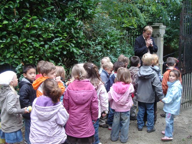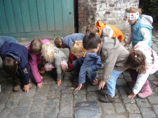 Op donderdag 27/9 brachten we een bezoekje aan de Laiterie: de kasteelhoeve. In onze hand een zwart-wit foto bracht ons naar de juiste plaats. Is dit de Laiterie? Kijk eens goed naar de foto? Ja, groot en vele trapjes en een grote poort. We bleven even stil staan aan de overkant op de stoep. Zo konden we duidelijk zien waar het nieuwe en oude gedeelte was. Kijk, juf, die ramen zijn rot en die stenen zijn stuk... aan de andere kant daarentegen nieuwe ramen en nieuwe stenen! Wat een verschil!!