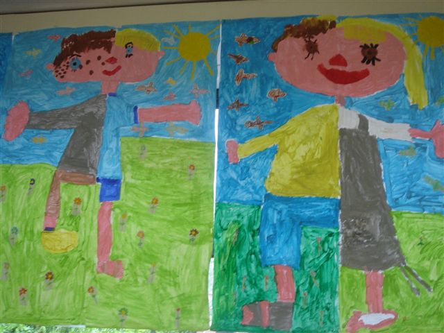 Op het einde van ons thema kregen onze schilderwerkjes een plaats in onze klas en dan werd alles nog eens besproken. Wie zijn linkerkant is er hier geschilderd? Van wie is de rechterkant? Hoe zit het met de bloemetjes en de vogeltjes aan de linkerkant, aan de rechterkant? We trachtten zo goed mogelijk te verwoorden hoeveel bloemetjes er werden getekend, hoeveel vogeltjes,... Hier stond omgaan en begrijpen van rekentaalbegrippen centraal (1 meer, 1 minder, 2 meer, 2 minder)