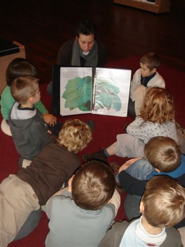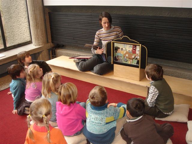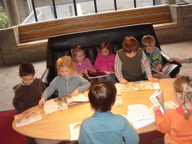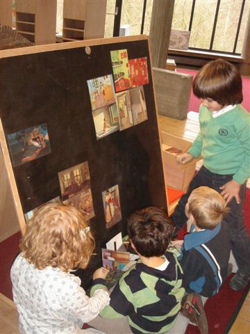 Een ander groepje genoot van een verhaaltje. Niet uit een boek maar wel met de kijkkast! De begeleidster schoof elke keer een andere prent voor de kast. Zo wist ze wat meer te vertellen over vrolijke rommel'.