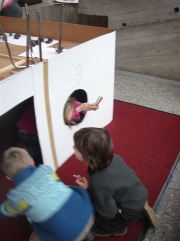 Het andere groepje kreeg de uitdaging om een huis te maken uit karton. Met schaar, lat, potloden, papier, mesjes, stiften,... gingen ze aan het werk. Een hele karwei om met 9 kleuters 1 huis te maken.
