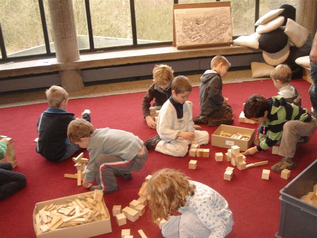 Ons bezoek aan de studioklas werd afgesloten met een vrij bouwmoment op de mat. Hier kon elke rakker naar believen zijn huis, zijn villa, zijn appartement, zijn tent kortom zijn woonst opbouwen met losse houten blokken. Veel variatie en veel fantasie.