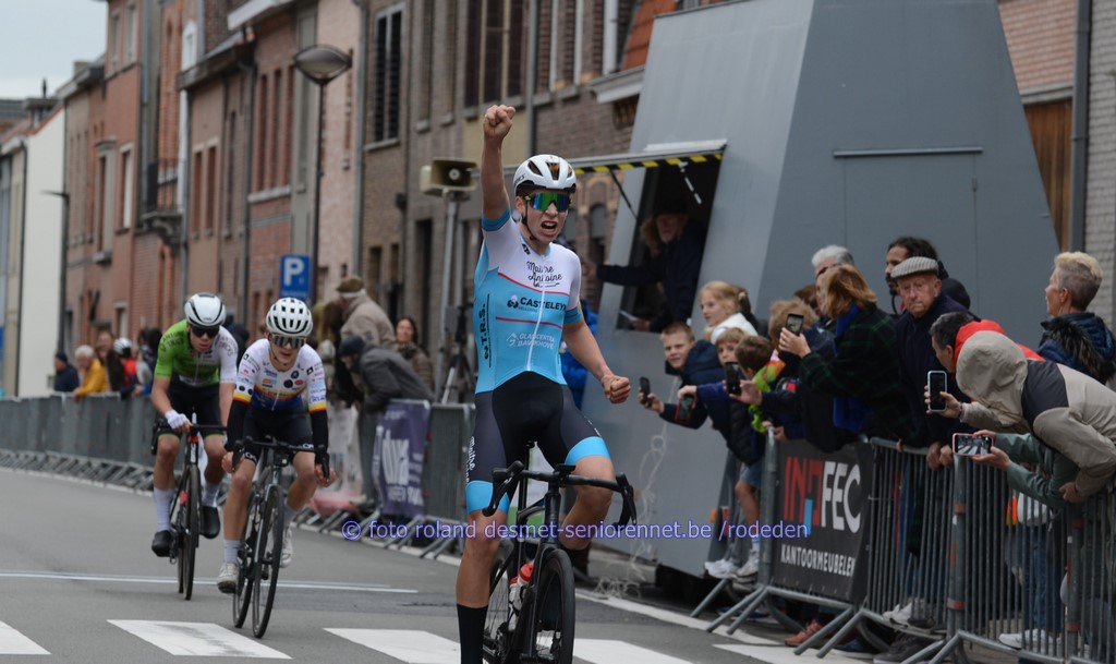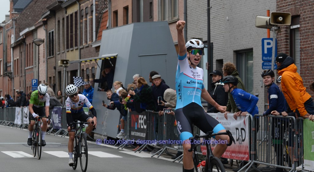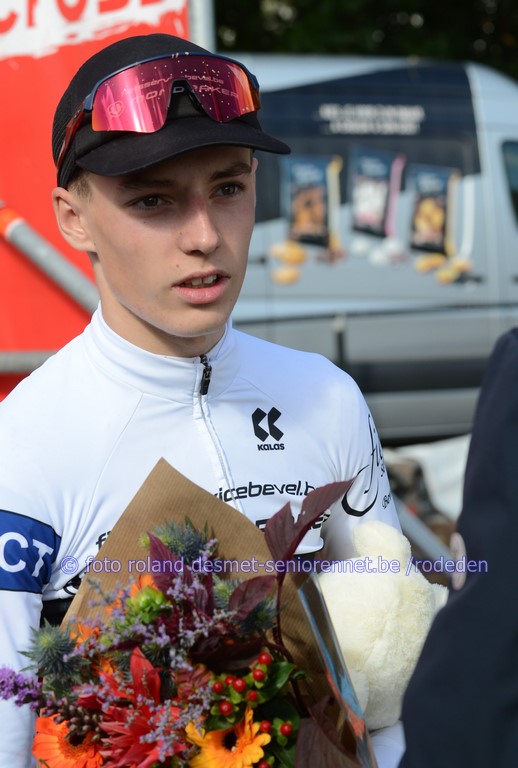 de Brit Benjamin Arey won de pelotonspurt voor de 5e plaats voor favoriet Kyano Cottignies, Thor Peeters,8e Loic Ossieur, 9.Bas Vandenbulcke 10.Thomas Waites (GB) Lennert Everaert uit Berlare de primus het podium met organisatoren Isabelle Delarue en Kris Spiesschaert , Maurice Bral en links Schepen van Sport Jens Danneels