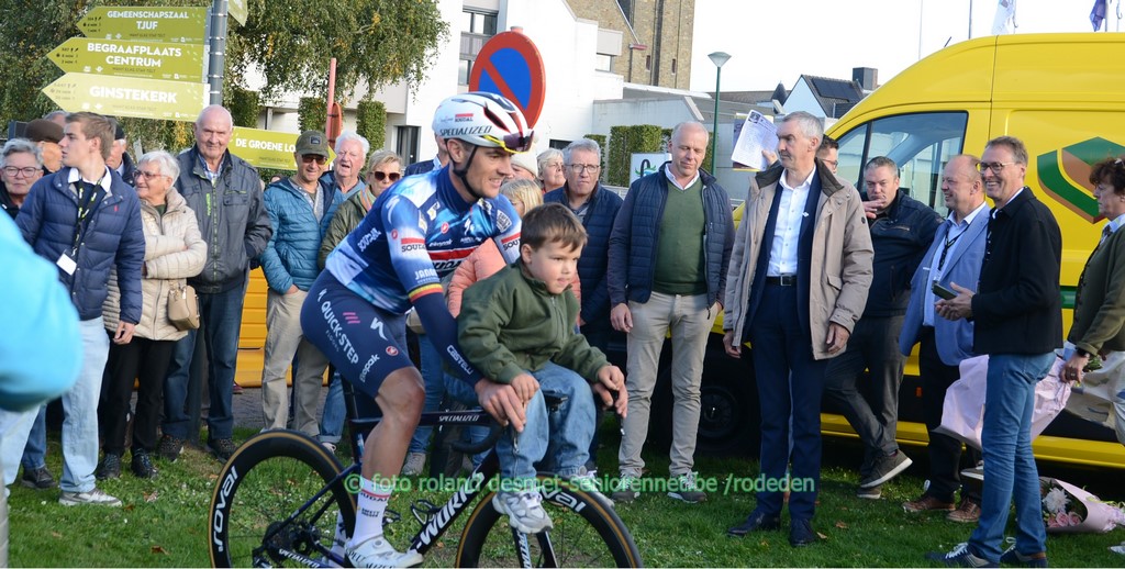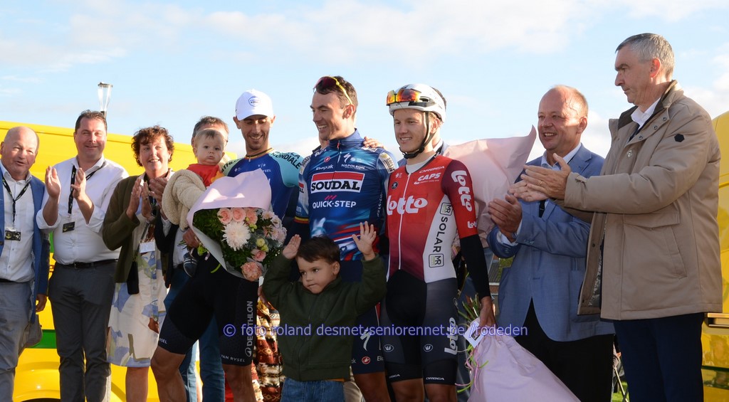 Cameron Vandenbroucke met zoontje Jules kijkend naar het podium waar manlief Tim Merlier op de 3e plaats stond altijd even vriendelijk mijn stadsgenoot Warre Vangheluwe, eindigde in het peloton na heel wat kopwerk voor Tim Merlier.... Burgemeester Veronique Buyck en kunstenaar Marc Vanhecke
