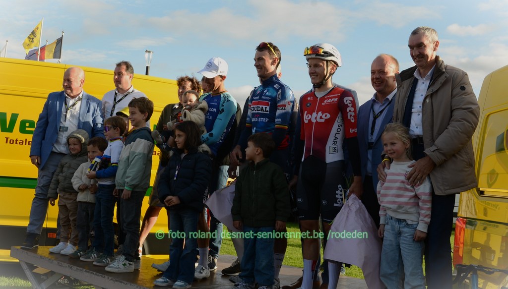 Abrahamsen Jonas de Lotto ploeg mocht sjaals uitsmijten..... hieronder Alec Segaert met zijn worp mooie truitjes Lidl Trek met oa.Tim Declercq en Mads Pedersen Patrick Lefevere (kwam met helicopter...) , Luc Maes (Latexco) en Frans Decock (Q St) werden gehuldigd voor hun trouwe medewerking aan de E3-prijs