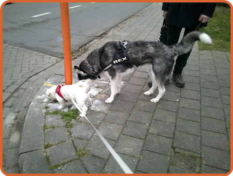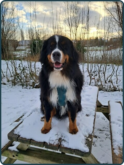 . Dat is Oona , een rustige en goed opgevoede Ridgeback.. . . Dat is Rex , Husky , soms legt hij zijn poten op mijn schouders om mij een dikke zoen te geven. . Buiten de 2 vorige hebben we nog : Taycko , CavalierCharles Harry , jachthondBarry , Labrador , mishandeld geweest en zeer bang , heeft een gouden mandje gevonden bij de nieuwe baasjes , wijkt geen meter van zijn baasje en is zeer lief. Trixie , mix van ? kan het heel goed vinden met Floche , crossen al van ver naar elkaar toe en ze ravotten er op los.. En dan hebben we Buda , Berner senner. Als hij met z'n 40 à 45 kg tegen je opspringt , dan mag je stevig op uw voeten staan of ergens tegenaan leunen. Zot , onnozel , speels , lief (gelijk zijn baasje > zottekes). Als je durft uw handen in uw zakken steken , dan weet hij dat hij een snoepje zal krijgen.. . . . Foto toegestuurd gekregen van het baasje van Buda , een zonnebadende sneeuwman , je moet er maar opkomen. . Ziezo , dat waren een paar vriendjes van Floche , al is hij met dit weer niet happig om naar buiten te gaan. . Ik wens u een al bij al een fijn weekend en.......hou het droog.