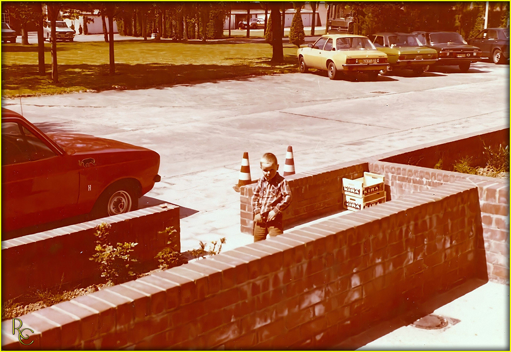 Zonen van binnenwonend personeel van de brigade Kortrijk. Foto genomen aan de woningen kant van de Graaf Boudewijn IX laan. Allemaal keurig gekleed, waarschijnlijk juist voor een uitstap. Er was onderling een ware vriendschap, nu nog na vele jaren is iedereen er positief over. Allemaal baby-boomers uit de jaren 1950.