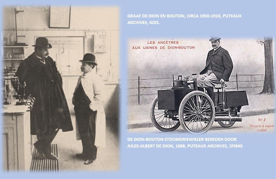 Het bedrijf werd opgericht door de graaf Jules-Albert de Dion, Georges Bouton en Boutons zwager Charles Trépardoux. De Dion had de financiering; Bouton en Trépardoux hadden de kennis. De drie mannen besloten hun krachten te bundelen en richtten in Parijs een werkplaats voor de bouw van stoommachines op. Het bedrijf werd in 1883 opgericht, vóór het einde van 1883 had het bedrijf een vestiging geopend in een pand in de Passage de Léon, Parijs. De werkplaats in Parijs werd al snel te klein. De precieze voorwaarden van de verhuizing is niet duidelijk. Het lijkt erop dat in Puteaux, rue des Pavillons, de voormalige stoommachinewerkplaats van een zekere Chaumé-Delabarre, in 1878 overgenomen door de ingenieurs Bénier en Pradel, beschikbaar kwam. Waarom juist deze werkplaats? De vraag blijft nog steeds onbeantwoord. Er was ongetwijfeld een gouden kans om het bedrijf te vestigen in een aantrekkelijke omgeving (dichtbij Parijs, dicht bij de Seine, met uitbreidingsmogelijkheden). Hoe dan ook, in 1883 verhuisden de drie mannen naar 20 rue des Pavillons. Het eerste patent werd datzelfde jaar aangevraagd. Puteaux is een gemeente in de westelijke buitenwijken van Parijs. Het ligt in het hart van het departement Hauts-de-Seine, 8,7 kilometer van het centrum van Parijs.