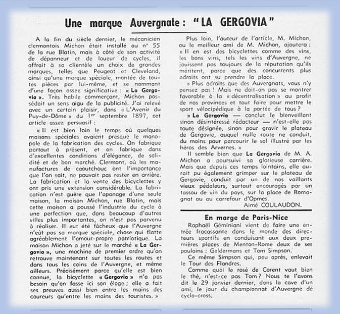 Op het einde van de 19e eeuw installeerde de mecanicien Michon uit Clermont-Ferrand zich in de rue Blatin n° 55, te Clermont-Ferrand. Naast zijn werk, het herstellen en het verhuren van fietsen, bood hij zijn cliënteel ook grote fietsmerken aan, zij hadden o.a. de keuze tussen Peugeot- en Clévelandfietsen maar ze konden ook kiezen voor een speciaal fietsmerk waarvan hij zelf alle stukken monteerde en ze een significante naam gaf : “ La Gergovia”. Dit merk van M.A. Michon zou een glorieuze ontwikkeling kennen. Op het plaatje zien we een beeltenis van Vercingetorix.