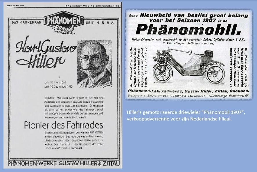 Vanaf 1910 begon het bedrijf ook met de productie van vierwielige motorfietsen voor personenauto's. Gustav Hiller overleed in 1913. Een jaar later werd de fabriek, onder leiding van zijn zwager, omgezet in een besloten vennootschap (GmbH) onder de naam Gustav Hiller GmbH. In 1916 werd de fabriek omgevormd tot een naamloze vennootschap (AG) onder de naam Phänomen-Werke Gustav Hiller AG. Gustav Hillers zoon, Rudolf Hiller, nam in 1921 de technische leiding van het bedrijf over.