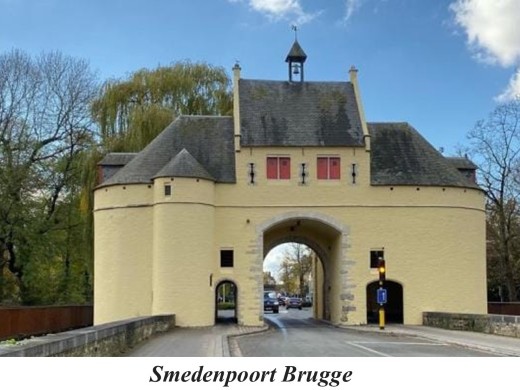 Vol enthousiasme ontmoet ik Rik aan het perron in het station Brugge. Mijn nieuwe fietsmaat heeft er al dik twee uur sporen opzitten en is blij mij te zien. Rik heeft gelukkig heel wat ervaring met lange afstandsfietstochten, hij kreeg van mij de reisroute-track en kan zijn GPS instellen net zoals mijn Garmin. Na een korte uitleg zijn we vertrokken. De weerberichten zijn eerder pessimistisch en voorspellen regenvlagen, toch kunnen we onze regenkledij in de fietstassen laten en dit gelukkig ook voor de volgende dagen. We vertrekken voor onze tocht, uit de hoofdstad van West-Vlaanderen langs de Smedenpoort. Deze poort is een van de vier overgebleven stadspoorten van Brugge.