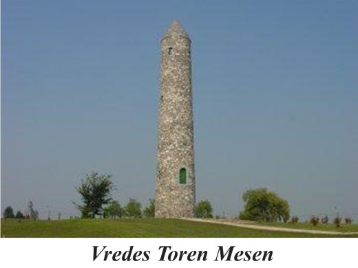 Vóór we bij het domein van de Palingbeek komen fietsen we na de dorpskern van Zillebeke, voorbij het “Larch Wood (Railway Cutting) Cemetery”. Een begraafplaats in een lariksbosje aan de spoorwegovergang. Nu door de Palingbeek, een groot natuurgebied aan het oude kanaal Ieper-Komen. Het is het grootste provinciedomein van West-Vlaanderen. Het is een zaligheid om te fietsen in dit glooiend en bosrijk landschap. Na poelen en moerassen, oud en jong bos, boomgaarden en bloemrijke graslanden, komen we aan de Golfclub. Tussen veel landbouw en na een helling zijn we in Wijtschate. We hebben iets meer dan 20km wanneer we in het allerkleinste stadje Mesen zijn. Mesen ligt op de taalgrens en heeft +/- 1.000 inwoners. Na de markt duiken we richting Ploegsteert tot bij het Iers Vredespark. We bewonderen de ronde toren, het is een typisch Iers symbool. Men herdenkt hier alle Ierse soldaten die sneuvelden tijdens WOI. Het Vredespark verwijst ook naar de Mijnenslag van 1917. Toen streden katholieke en protestantse Ierse soldaten zij aan zij.