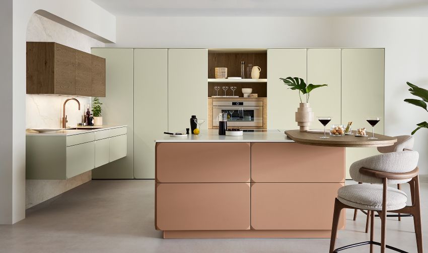 De trend soft seventies vertaalt zich in de keuken van DSM in een heerlijk zacht interieurconcept, waar een palet van poederroze, pistachegroen en romige lattekleuren de boventoon voert. Warm en rustgevend. Speels en toch ordelijk. Die zachtheid wordt verder versterkt door afgeronde hoeken en natuurlijke materialen zoals hout en fineer. Op een doordachte manier brengt DSM Keukens seventies-sentiment en moderne elementen samen in één ruimte. Moderne accenten wisselen af met vintage-geïnspireerde apparaten. Zo zijn een klassieke koffiezet of een broodrooster in pastelkleuren de perfecte finishing touch voor een stijlvolle tijdcapsule.