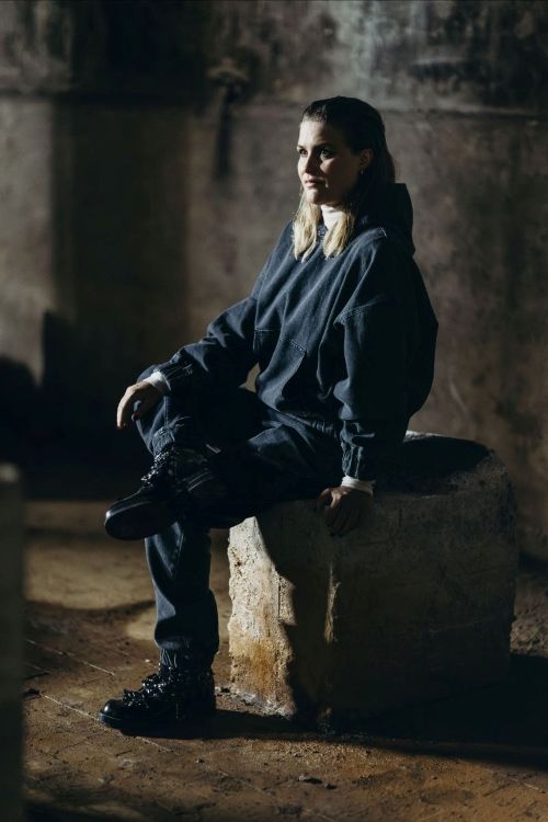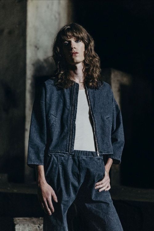 Een van de grootste uitdagingen bij recyclage is de samenstelling van de stof: een mix van materialen beperkt de recycleerbaarheid ervan. Murielle koos daarom voor een minimalistische en slimme herinterpretatie van iconische silhouetten zoals de bomberjack, de barn jacket en het trainingspak: zonder gelaagdheid in de stuks zelf, uit één stof en dus eenvoudiger te recycleren. “Voor het bomberjack gebruikten we geen voering, maar creëerden we volume in het patroon met één laag post-consumer denim. Zo blijft het iconisch, maar is het ook recycleerbaar. Bovendien ontwierpen we twee lichtere stukken – een hoodie en een bomberjack – die je apart kan dragen of volumineus door ze te combineren. ” vertelt Murielle.
