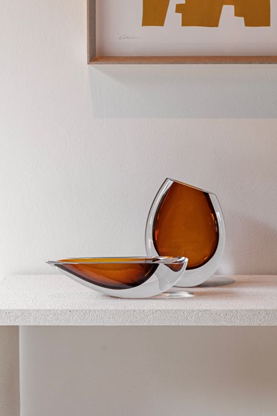 Een kleur die warmte en sfeer ademt : Dark Ambar belichaamt de kracht van eenvoud met een rijk en gelaagd karakter. De diepe tint brengt warmte en geborgenheid in elk interieur en laat zich moeiteloos combineren met natuurlijke materialen zoals hout, steen en textiel. Het kristalheldere glas vormt een pure omlijsting voor de intense kleurkern, waardoor elke vaas een subtiel spel van licht en schaduw creëert. Zo ontstaat een object dat zich voortdurend heruitvindt afhankelijk van de ruimte, de inval van het licht en het moment van de dag.