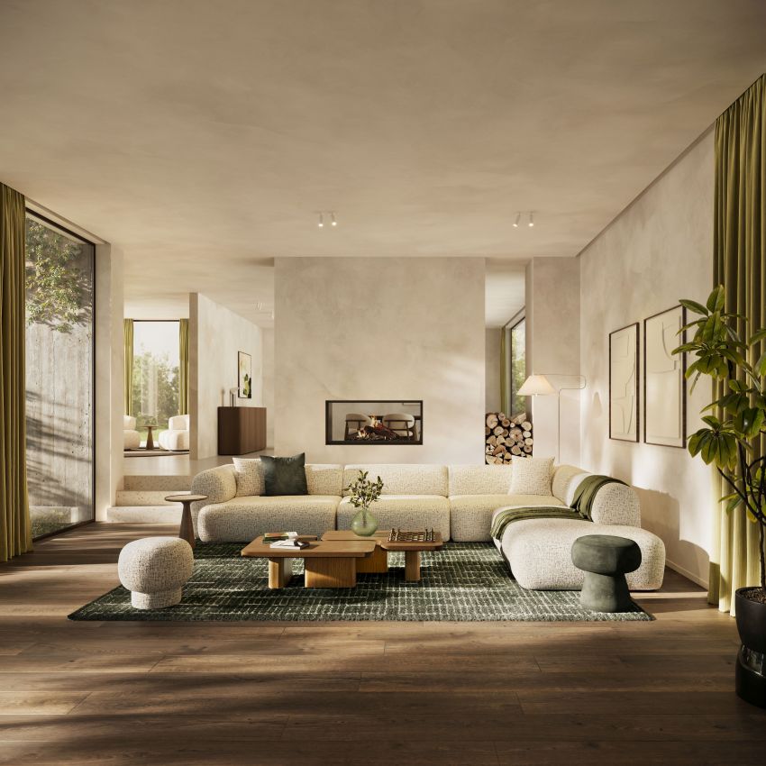 Samenhorigheid en verbondenheid komen in dit interieur op drie niveaus tot uiting. De basis wordt gevormd door zorgvuldig gekozen materialen. Zachte, matte gespikkelde stoffen zoals de Tropo Moss van Juntoo worden subtiel afgewisseld met glanzend velvet. De speelsheid van deze stoffen wordt aangevuld en in balans gebracht door de vertrouwde warmte van walnoot en gerookte eik. Olijf- en groentinten zorgen voor een verbindend element, terug te vinden in de Trapani en Cefalu tapijten, Baci kussens en accessoires, waardoor de overgang tussen meubels soepel en harmonieus verloopt.