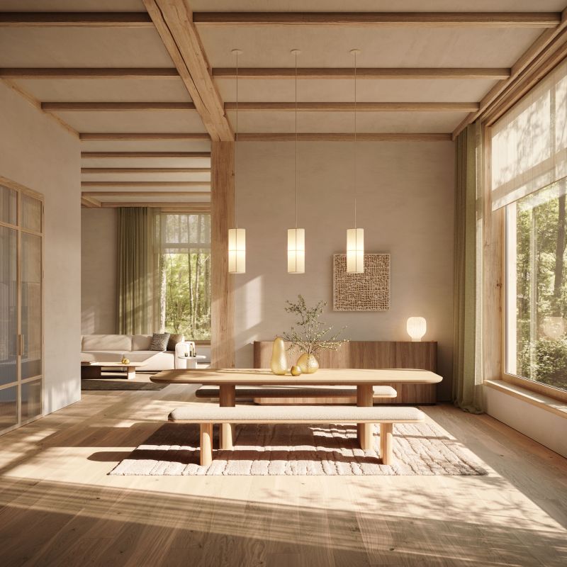 In dit Juntoo-interieur wordt gezelligheid niet gezocht in opgeblazen vormen, maar in een serene lijnvoering die natuurlijke materialen en tactiele texturen laat schitteren. Warme saffraankleurige accenten en geribbeld hout vullen elkaar aan, terwijl travertin een subtiele diepte toevoegt. Een rustig canvas door uitgepuurde lijnen geeft materialen de ruimte om te spreken.