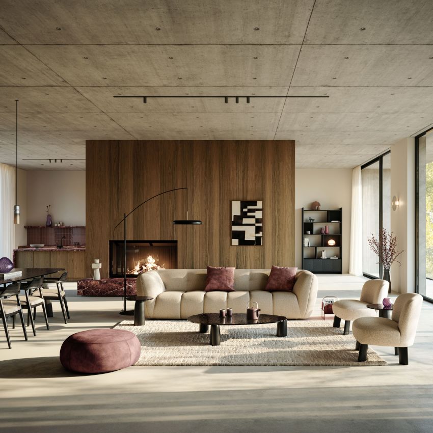 Textiel speelt een even belangrijke rol in deze luxueuze harmonie. De modulaire Chubbi zetel brengt warmte en comfort; het golvende ontwerp van de zitting nodigt uit om plaats te nemen en te genieten van een unieke zitervaring. Fluwelen accenten, zoals die van de Basso poef en Baci kussens, verrijken de ruimte met een verfijnde glans. Zo ontstaat een interieur dat warmte en luxe uitstraalt, gedragen door materialen die tijdloos mooi blijven.